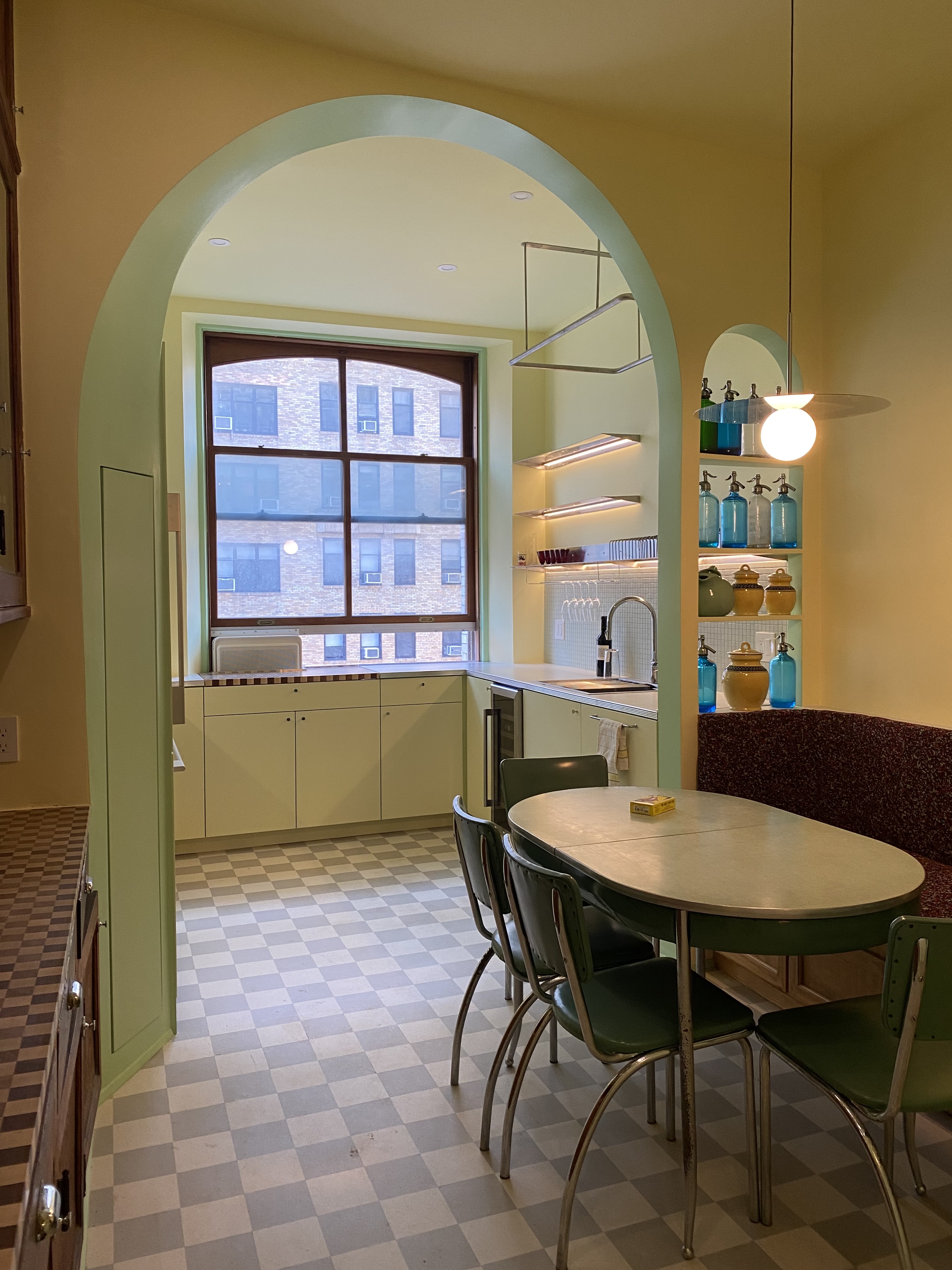 Soft-Firm was tasked with splicing a modern kitchen into the space, while preserving the collective memories of loved ones who have gathered around the kitchen table. The project integrates the owner’s china cabinet and enhances existing arched geometries with custom lime and citrine hues, referencing the space’s previous color scheme. Linoleum counters and floors, stainless steel accents, and a vintage dining set sourced from upstate New York evoke classic moments of Americana.